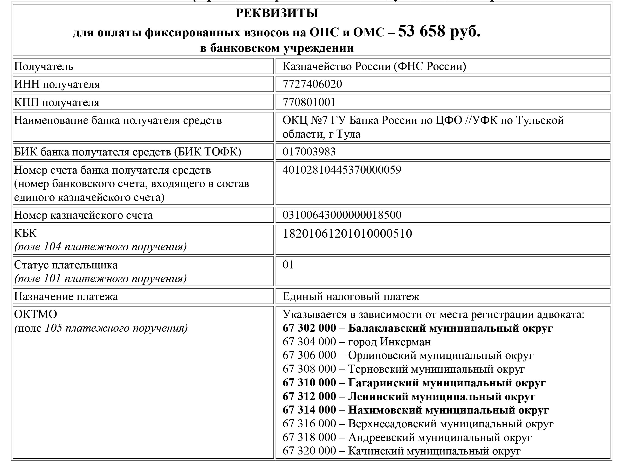Оплата в банковском учреждении производится по следующим единым реквизитам: