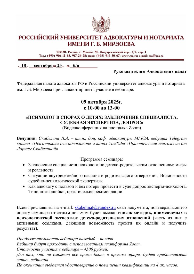 Федеральная палата адвокатов РФ совместно с Российским университетом адвокатуры и нотариата им. Г. Б. Мирзоева приглашают принять участие в следующих семинарах: