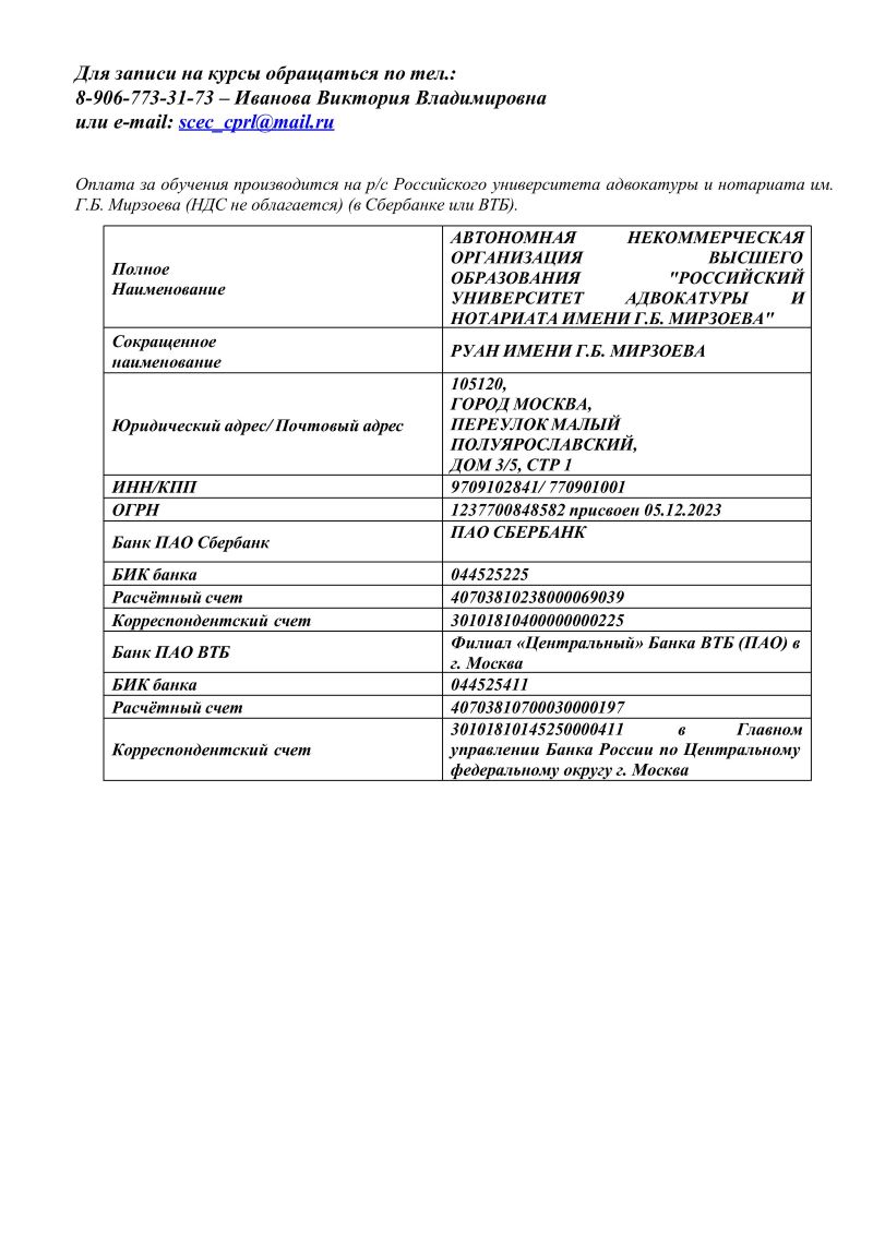 Оплата за обучения производится на р/с Российского университета адвокатуры и нотариата им. Г.Б. Мирзоева (НДС не облагается) (в Сбербанке или ВТБ).